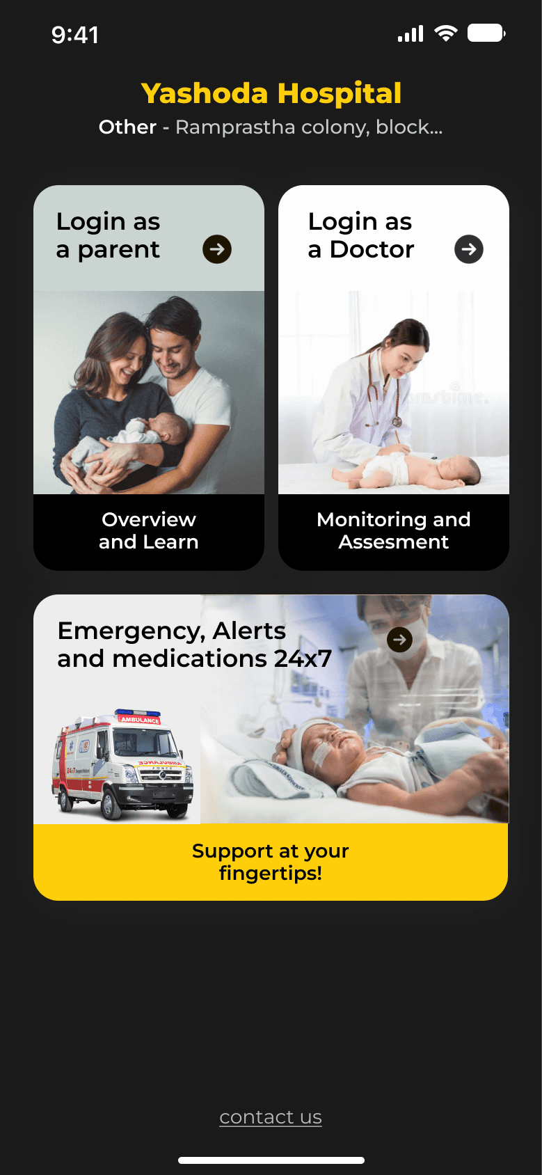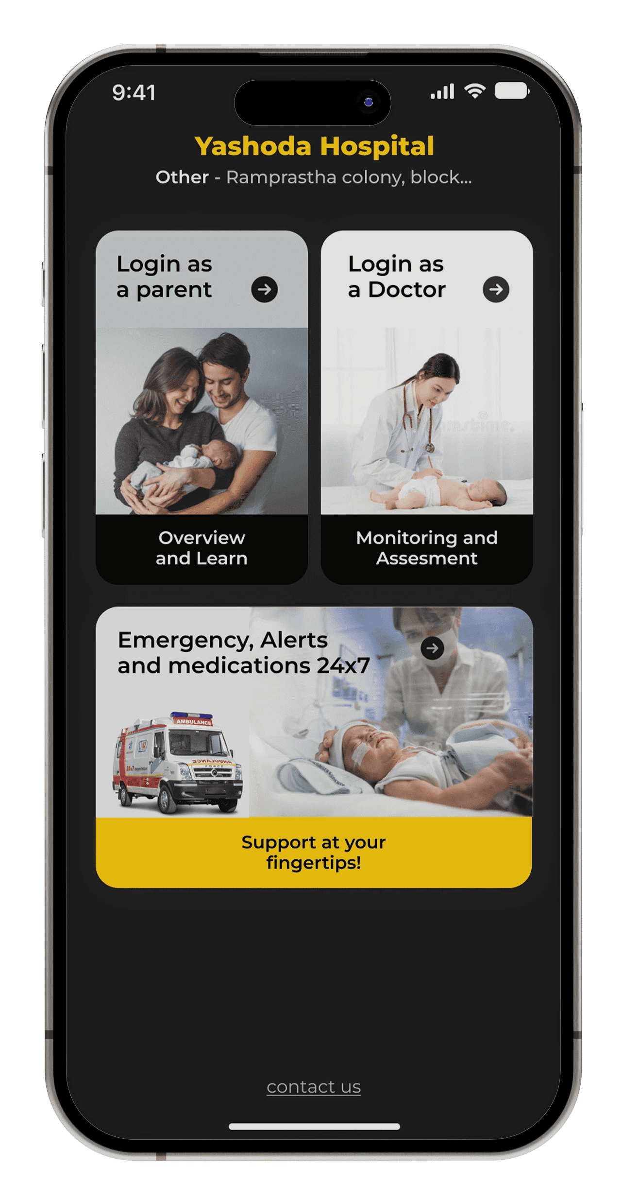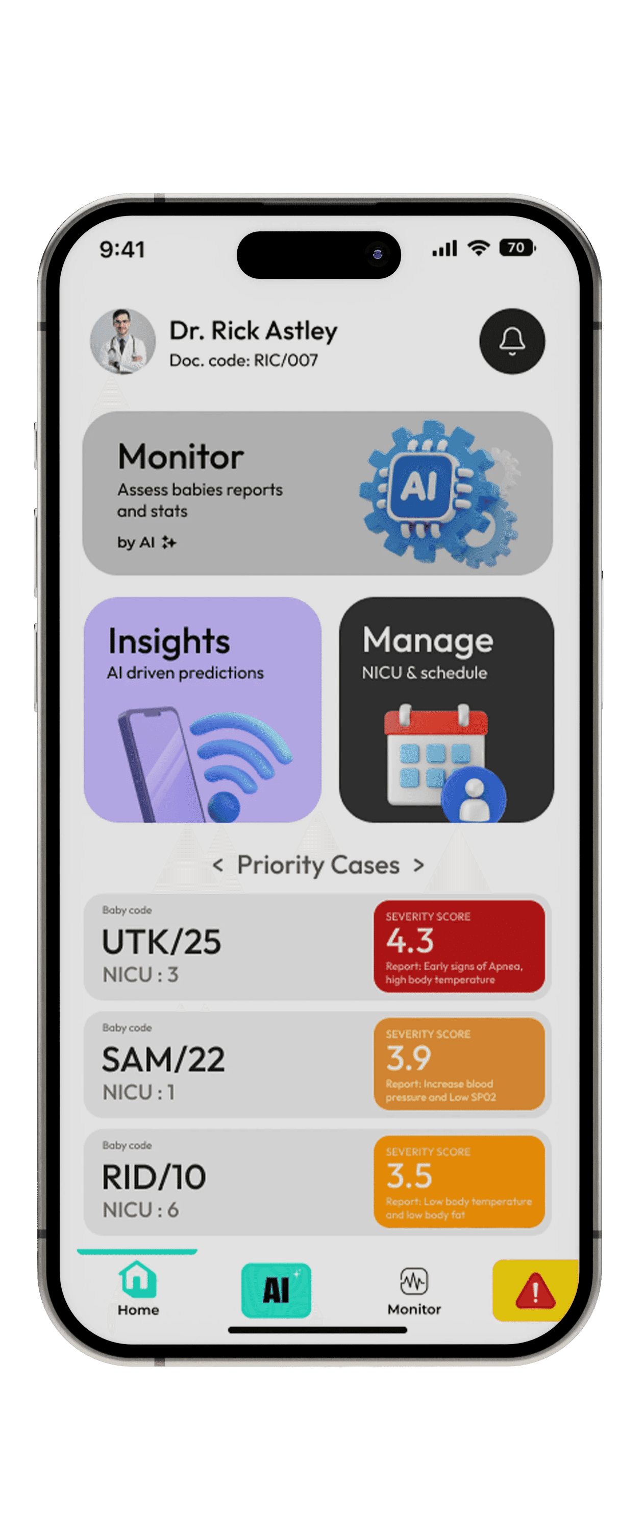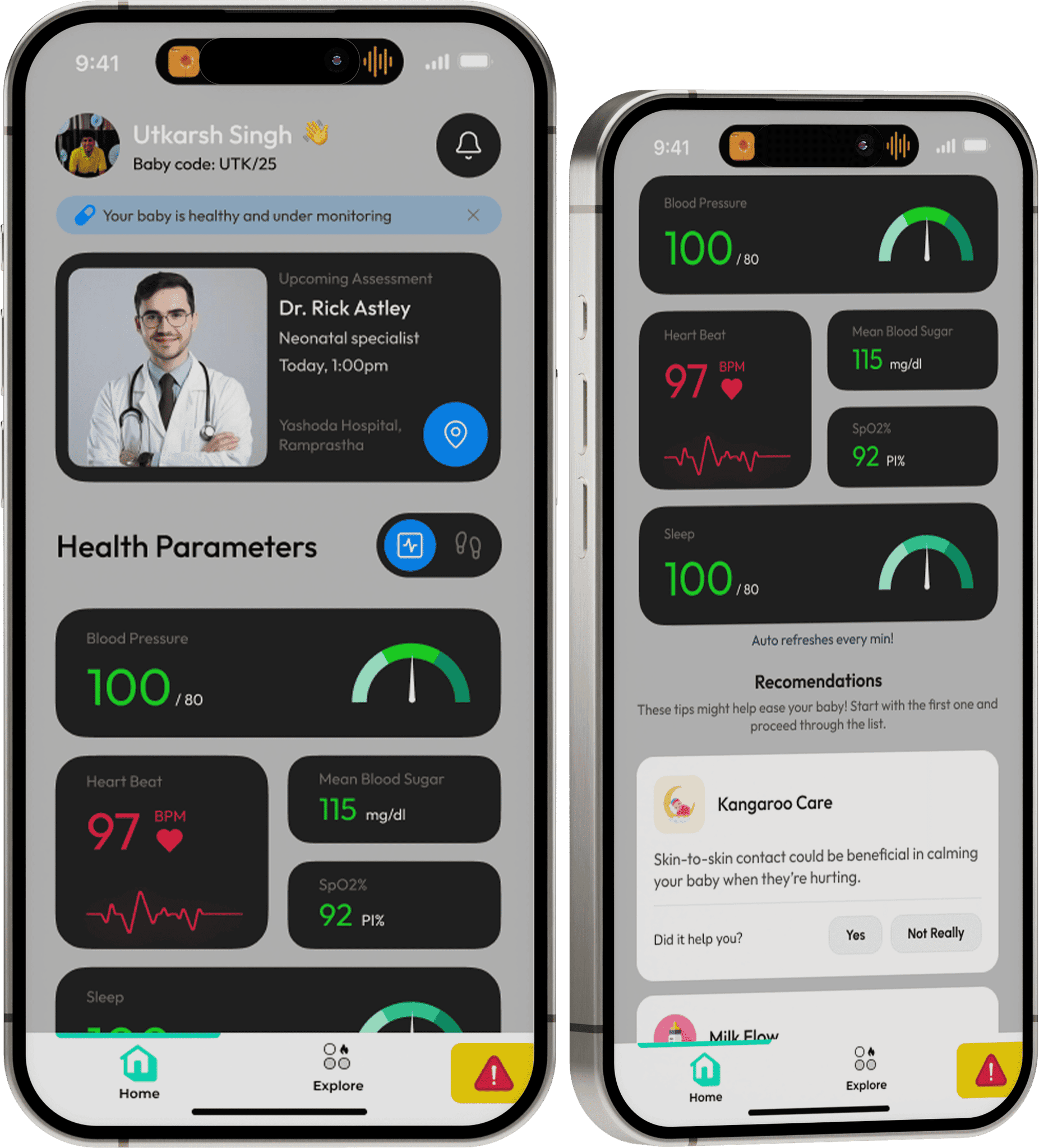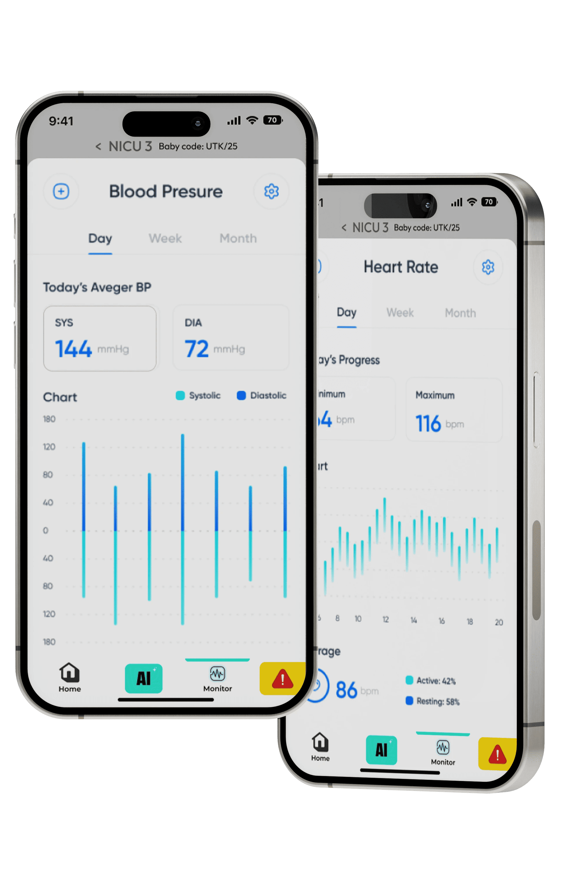 Clinician & Parent Apps A dual-app ecosystem: clinicians get real-time vitals, alerts, and trends; parents receive simplified health updates, guidance, and care reminders—all seamlessly synced.