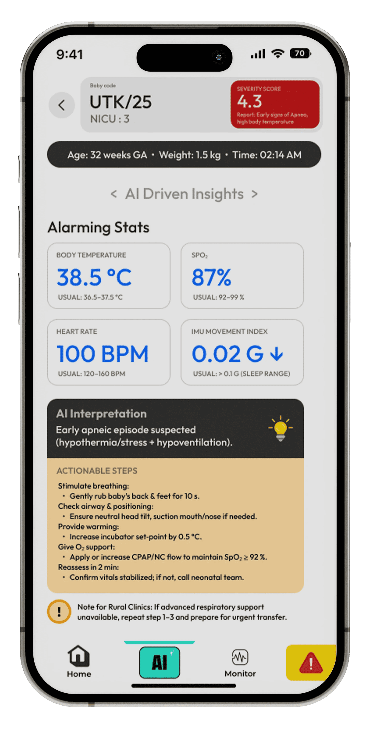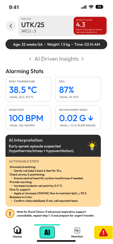 Our AI-driven system interprets vital signs to detect neonatal issues like sepsis or apnea and delivers clear, step-by-step care instructions—such as "initiate warming" or "administer antibiotics"—through a user-friendly interface. This empowers nurses in rural and underserved areas to make timely, informed decisions, enhancing neonatal care where specialist access is limited.