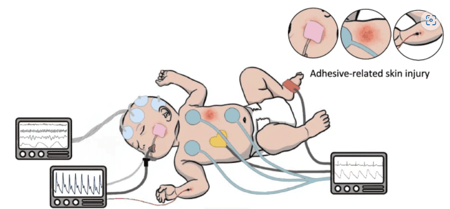 Premature skin is 20–40% thinner than adults’. Rigid sensors and aggressive adhesives cause dermatitis, blisters, erosions, and lifelong scarring. Wires that dangle or touch contaminated surfaces elevate nosocomial infection risk.