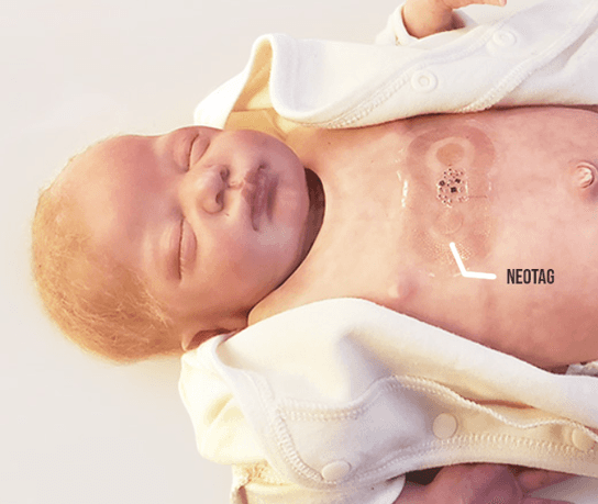 Neotag: dual‑site wireless skin‑like patches (chest & ankle) with ECG, PPG, motion, temperature sensors and more. BLE micro‑patches stream to an AI dashboard for doctor and parent app, issuing real‑time alerts for apnea, arrhythmia, sepsis etc.