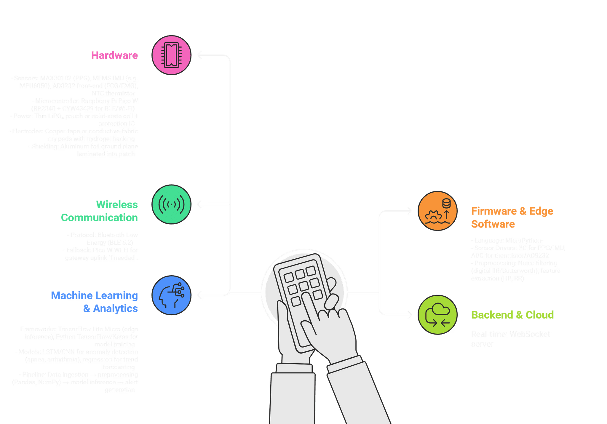 Scalable, Secure Cloud Backbone HIPAA-grade encryption with REST/MQTT APIs and time-series databases ensures data flows securely from patch to caregiver, enabling both bedside and remote monitoring.